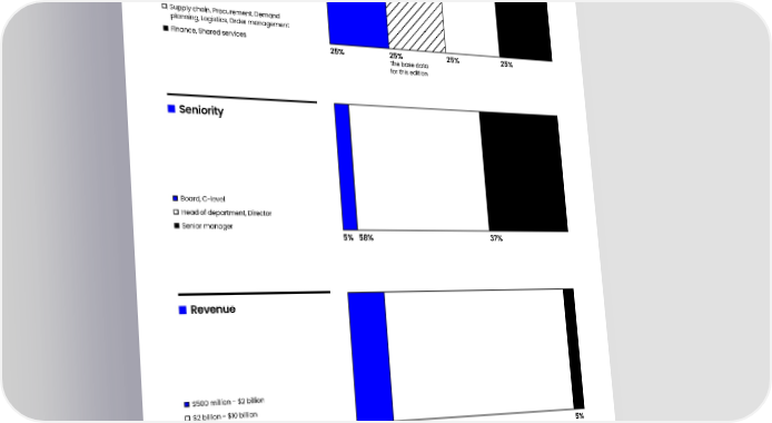 Job function Operations, Process improvement, Process excellence IT, Digital Supply chain, Procurement, Demand planning, Logistics, Order management Finance, Shared services 25% 25% 25% 25% The base data for this edition Seniority Board, C-level Head of department, Director Senior manager 5% 58% 37% Revenue $500 million - $2 billion $2 billion - $10 billion More than $10 billion 15% 80% 5% The Process Era is Here: IT Edition 20