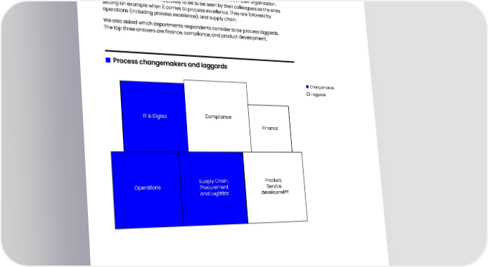 IT leaders are driving adoption The IT function is often driving the process optimization agenda forward. Even though they are most likely to see process complexity as a barrier to optimization, they are still pushing ahead and 昀椀nding value opportunities in those processes. As part of the cross-functional survey, we asked business leaders which departments they see as actual or potential change makers in their organization. IT and digital teams are most likely to be to be seen by their colleagues as the ones setting an example when it comes to process excellence. They are followed by operations (including process excellence), and supply chain. We also asked which departments respondents consider to be process laggards. The top three answers are 昀椀nance, compliance, and product development. Process changemakers and laggards Changemakers Laggards IT & Digital Compliance Finance Operations Supply Chain, Product, Procurement Service and Logistics development The Process Era is Here: IT Edition 17