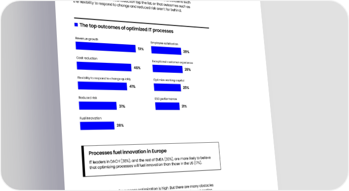 The outcomes of process optimization It’s clear IT leaders understand the need to optimize processes to meet their objectives, both at the function and organizational level. To get a deeper understanding of the speci昀椀c outcomes they’re achieving or believe can be achieved by using the process lever, we asked them to pick their top three. In the current economic climate, it’s no surprise that 昀椀nancial concerns such as revenue growth and cost reduction top the list, or that outcomes such as the 昀氀exibility to respond to change and reduced risk aren’t far behind. The top outcomes of optimized IT processes Revenue growth Employee satisfaction 51% 28% Cost reduction Exceptional customer experience 46% 28% Flexibility to respond to change quickly Optimize working capital 41% 25% Reduced risk ESG performance 31% 21% Fuel innovation 28% Processes fuel innovation in Europe IT leaders in DACH (38%), and the rest of EMEA (30%), are more likely to believe that optimizing processes will fuel innovation than those in the US (17%). Overall, enthusiasm for process optimization is high. But there are many obstacles in the way, causing businesses to pay a high price, as we’ll see in the next section. The Process Era is Here: IT Edition 7