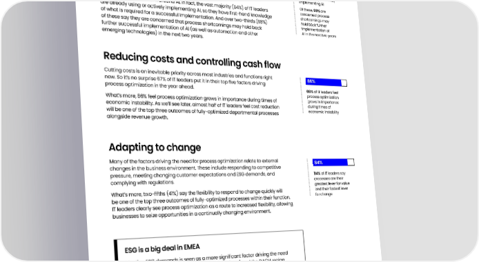 Harnessing AI and innovation IT leaders may be best placed to understand the enormous value AI can unleash 68% 94% for their organization. But they are also best placed to understand the foundations enterprises must lay before AI can truly deliver on its promise. As we’ve seen, 81% 94% of IT leaders are of IT leaders say interest in harnessing AI and other emerging technologies is already using or actively a major factor driving the need to optimize processes in the next 12 months. implementing AI There’s clear momentum around AI. In fact, the vast majority (94%) of IT leaders Of these, 68% are concerned process are already using or actively implementing AI, so they have 昀椀rst-hand knowledge shortcomings may of what is required for a successful implementation. And over two-thirds (68%) hold back further of these say they are concerned that process shortcomings may hold back implementation of further successful implementation of AI (as well as automation and other AI in the next two years emerging technologies) in the next two years. Reducing costs and controlling cash 昀氀ow Cutting costs is an inevitable priority across most industries and functions right 86% now. So it’s no surprise 67% of IT leaders put it in their top 昀椀ve factors driving process optimization in the year ahead. 86% of IT leaders feel process optimization grows in importance What’s more, 86% feel process optimization grows in importance during times of during times of economic instability. As we’ll see later, almost half of IT leaders feel cost reduction economic instability will be one of the top three outcomes of fully-optimized departmental processes alongside revenue growth. Adapting to change Many of the factors driving the need for process optimization relate to external 84% changes in the business environment. These include responding to competitive pressure, meeting changing customer expectations and ESG demands, and 84% of IT leaders say processes are their complying with regulations. greatest lever for value What’s more, two-昀椀fths (41%) say the 昀氀exibility to respond to change quickly will and their fastest lever for change be one of the top three outcomes of fully-optimized processes within their function. IT leaders clearly see process optimization as a route to increased 昀氀exibility, allowing businesses to seize opportunities in a continually changing environment. ESG is a big deal in EMEA Meeting ESG demands is seen as a more signi昀椀cant factor driving the need for process optimization by IT leaders in EMEA (68%) and the DACH region (64%) than by those in the US (54%). The Process Era is Here: IT Edition 5